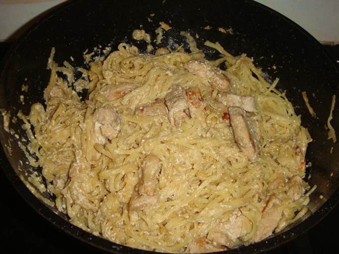 • Лапшу выложить в сковороду и аккуратно перемешать с мясом. Прогреть пару минут. Разложить пасту по тарелкам и посыпать рубленой петрушкой.