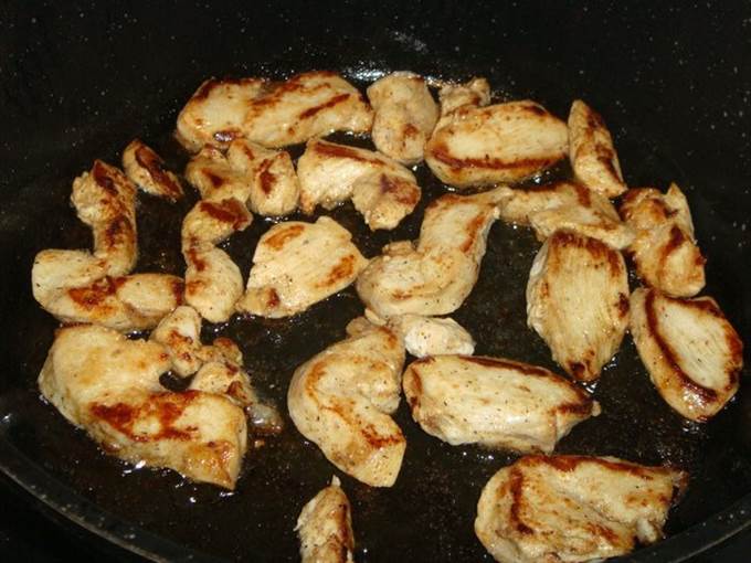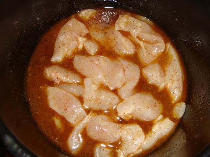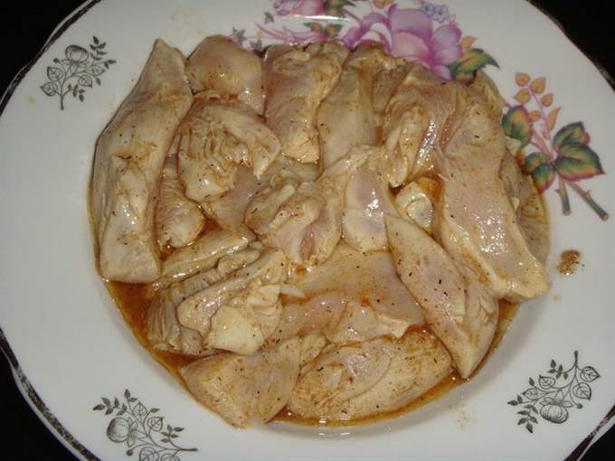 • Куриное филе промыть и нарезать полосками. Выложить кусочки филе в кастрюльку и перемешать с маринадом. Убрать в холодильник на 1 час.