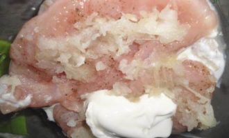 • Репчатый лук и чеснок очистим и натрем на мелкой терке. Теперь слоями выкладываем в миску курицу, луковую смесь, сметану. Повторяем слои, если нужно. Затягиваем миску пленкой и ставим в холодильник на ночь.