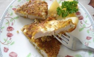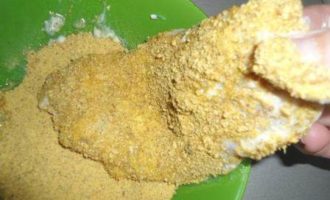 • Разогреваем масло в сковороде. В одной миске вбиваем яйцо (если мелкие надо будет 2 шт.) в другую миску насыпаем сухари. Обмакиваем кусочек филе сначала в яйце, затем в сухарях и жарим до золотистой корочки, перевернув один раз.