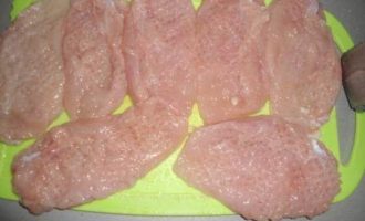 • Куриное филе отбиваем с двух сторон (не сильно тонко). У меня были кусочки небольшого размера, толщина около 0, 5 см. Солим, перчим по вкусу.