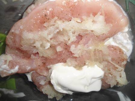 • Репчатый лук и чеснок очистим и натрем на мелкой терке. Теперь слоями выкладываем в миску курицу, луковую смесь, сметану. Повторяем слои, если нужно. Затягиваем миску пленкой и ставим в холодильник на ночь.