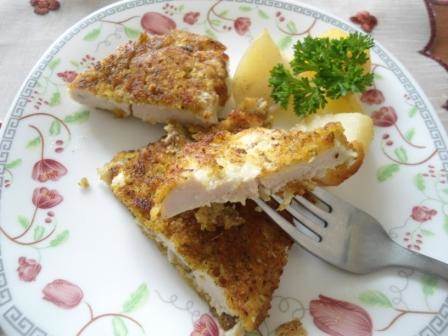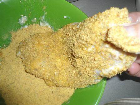 • Разогреваем масло в сковороде. В одной миске вбиваем яйцо (если мелкие надо будет 2 шт.) в другую миску насыпаем сухари. Обмакиваем кусочек филе сначала в яйце, затем в сухарях и жарим до золотистой корочки, перевернув один раз.