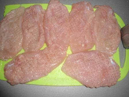 • Куриное филе отбиваем с двух сторон (не сильно тонко). У меня были кусочки небольшого размера, толщина около 0, 5 см. Солим, перчим по вкусу.