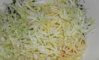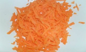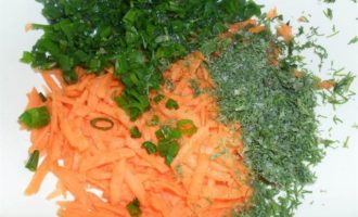 • Зеленый лук и укроп (укроп можно заменить на петрушку) мелко нарезать и добавить к моркови.