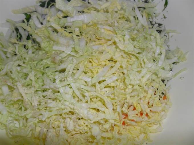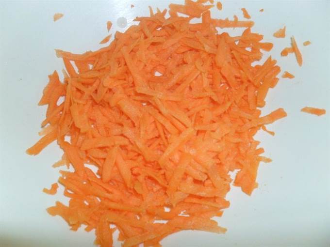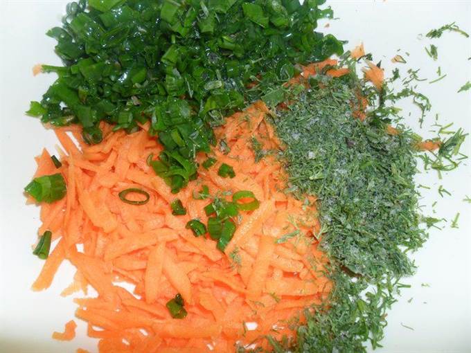 • Зеленый лук и укроп (укроп можно заменить на петрушку) мелко нарезать и добавить к моркови.