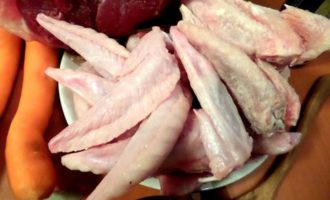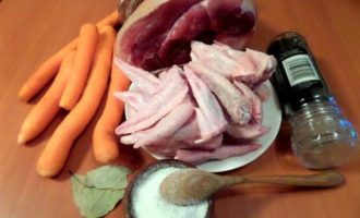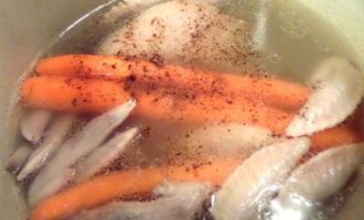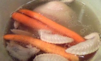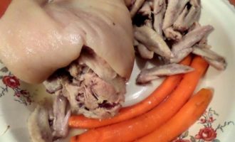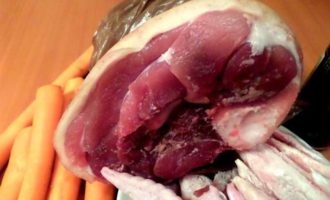 • Примерно через 1,5-2 часа варки рульки добавляем крылышки и морковку. Подливаем воды.