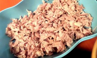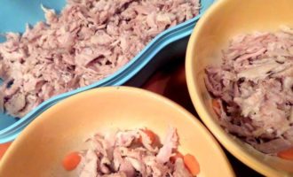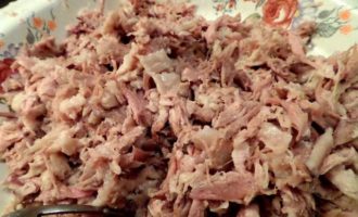 • Начинаем теребить мясо на волокна. Мне нравится это делать руками, так получается однороднее и нежнее) Кожу всю выбрасываю, но кто любит-можно и её порезать.