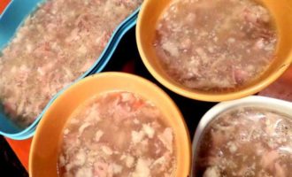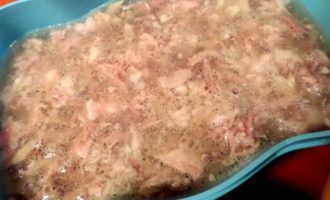 • Высокий слой желе я не делаю, а излишки бульона идут на суп. На этот раз сварила фасолевый, добавив воды.