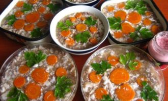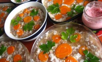 • Этот холодец делала раньше из этих же ингредиентов, только подавала прямо в пиалках, поэтому морковка и зелень наверху для украшения.