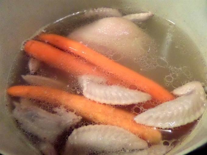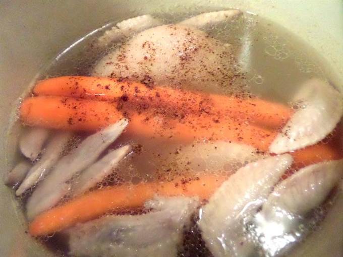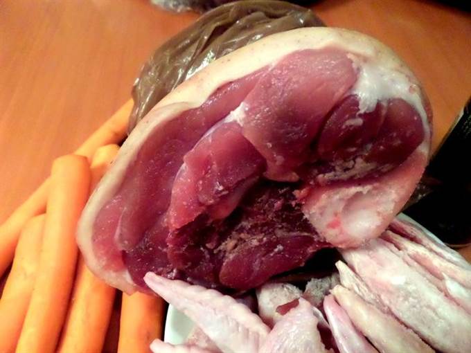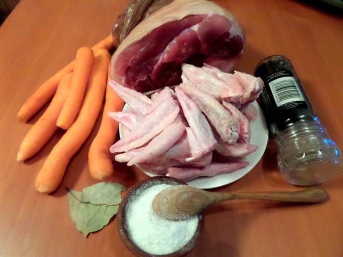 • Примерно через 1,5-2 часа варки рульки добавляем крылышки и морковку. Подливаем воды.