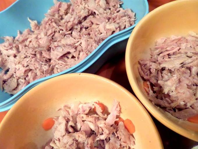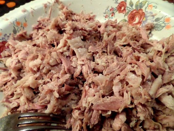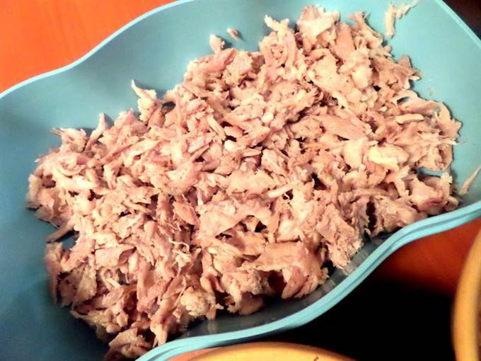 • Начинаем теребить мясо на волокна. Мне нравится это делать руками, так получается однороднее и нежнее) Кожу всю выбрасываю, но кто любит-можно и её порезать.