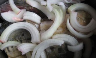 На лук положить две рыбьих головы, несколько кусочков рыбы.