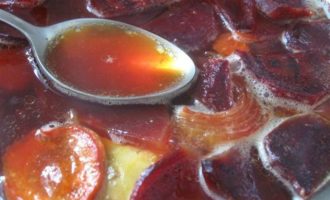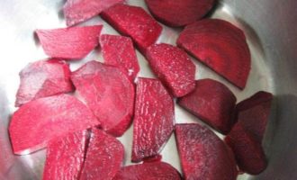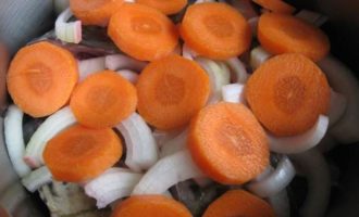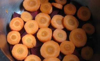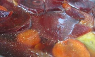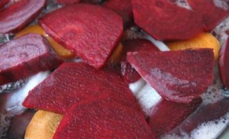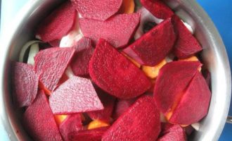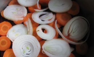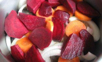 Лук, свеклу, морковь почистить. Нарезать крупными кружочками морковь, свеклу — полукольцами средней толщины, лук колечками.
