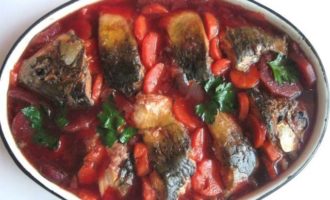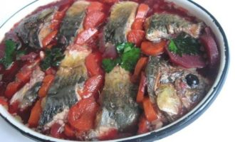 Как остынет рыба и овощи до теплого состояния, можно оформлять рыбу для подачи. Уложить кусочки рыбы, голову, хвост в виде рыбы. Каждый кусочек на некотором расстоянии один от другого. Маслину можно использовать для глаз. Промежутки между кусочками карпа заполнить овощами, залить бульоном.