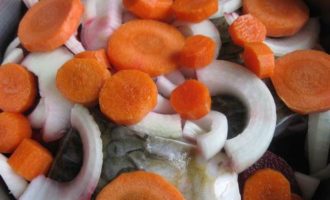 Затем несколько оставшихся кусочков рыбы и хвостовая часть. Затем — лук, морковь,.
