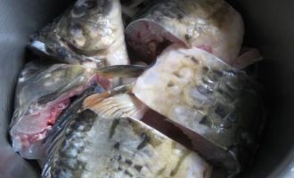 Карпов выпотрошить, вынуть жабры, глаза, промыть, промокнуть полотенцем, отрезать голову, нарезать крупно. У меня здесь небольшие карпы. Они поместились вместе с овощами в кастрюлю 3.5 литра, которая была наполнена почти до самого верха.