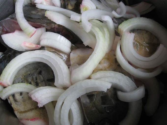 На лук положить две рыбьих головы, несколько кусочков рыбы.