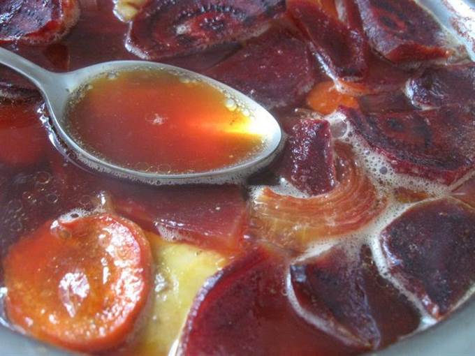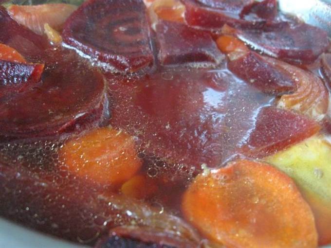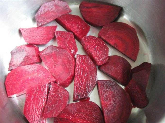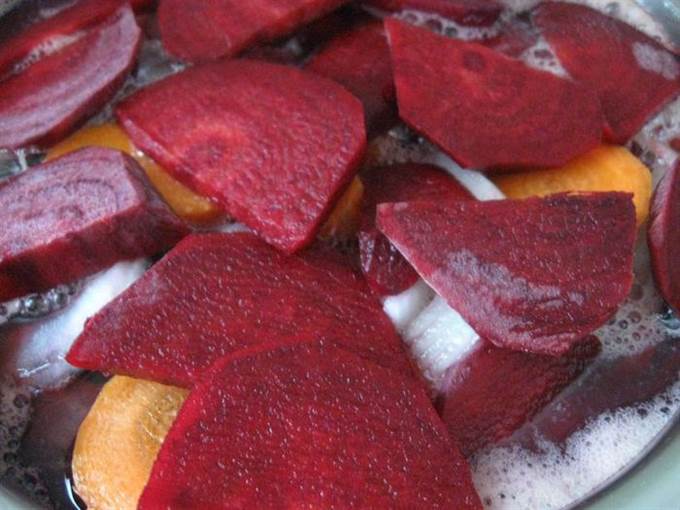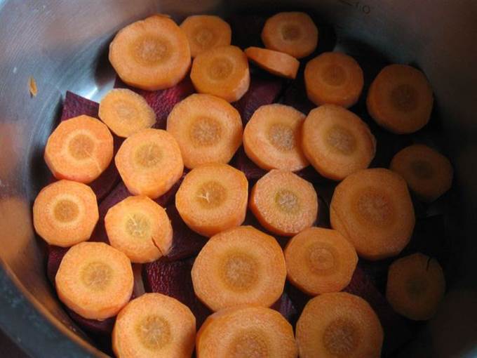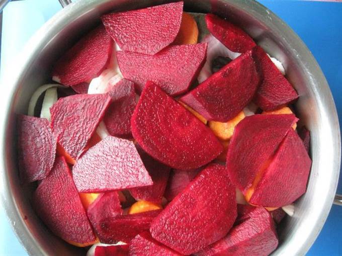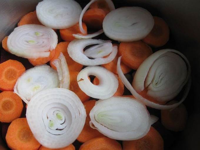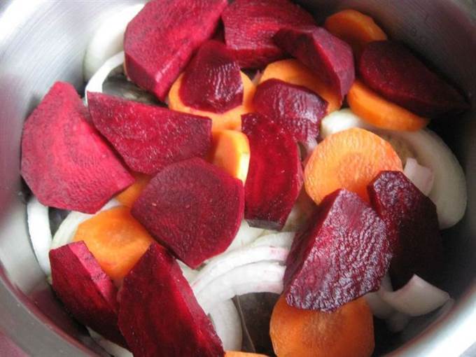 Лук, свеклу, морковь почистить. Нарезать крупными кружочками морковь, свеклу — полукольцами средней толщины, лук колечками.