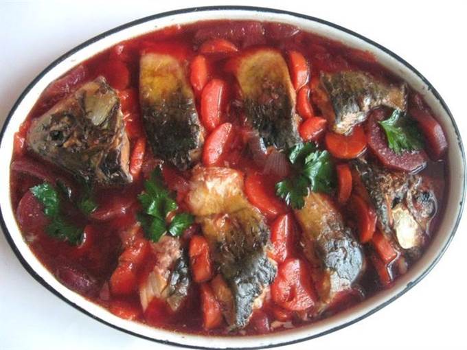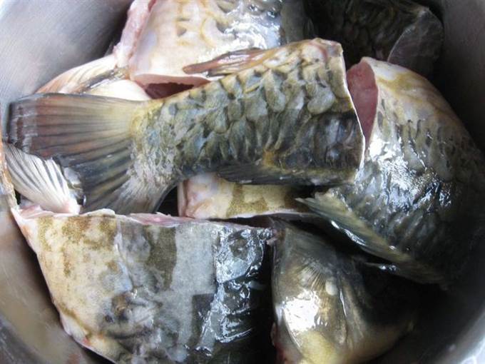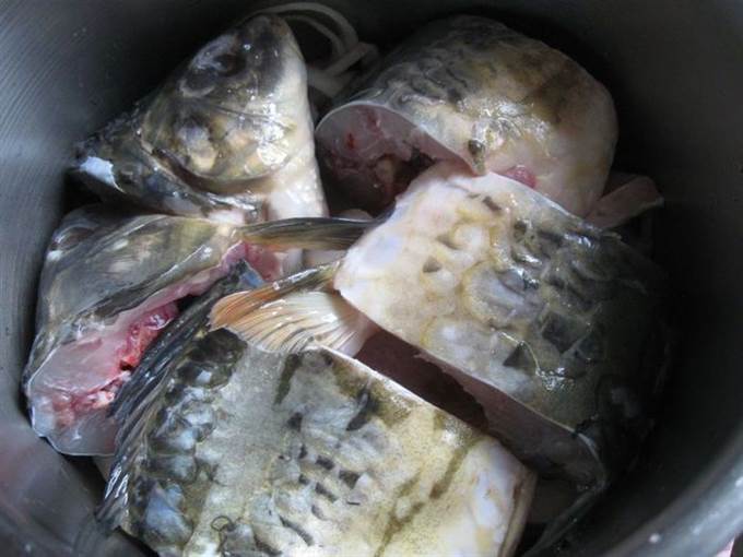 Карпов выпотрошить, вынуть жабры, глаза, промыть, промокнуть полотенцем, отрезать голову, нарезать крупно. У меня здесь небольшие карпы. Они поместились вместе с овощами в кастрюлю 3.5 литра, которая была наполнена почти до самого верха.