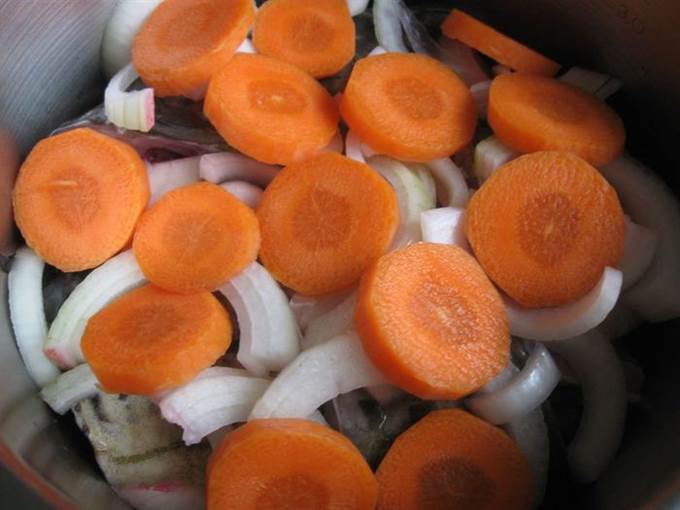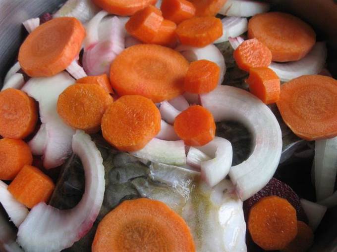 Затем несколько оставшихся кусочков рыбы и хвостовая часть. Затем — лук, морковь,.