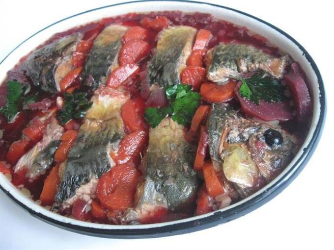 Как остынет рыба и овощи до теплого состояния, можно оформлять рыбу для подачи. Уложить кусочки рыбы, голову, хвост в виде рыбы. Каждый кусочек на некотором расстоянии один от другого. Маслину можно использовать для глаз. Промежутки между кусочками карпа заполнить овощами, залить бульоном.