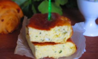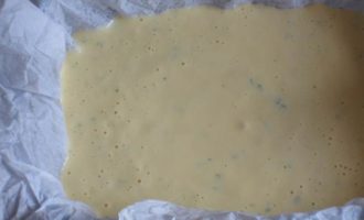 Пергамент намочить и хорошо отжать.Яичную смесь выложить в форму с пергаментом и запекать в разогретой до 180°С духовке 35 минут.