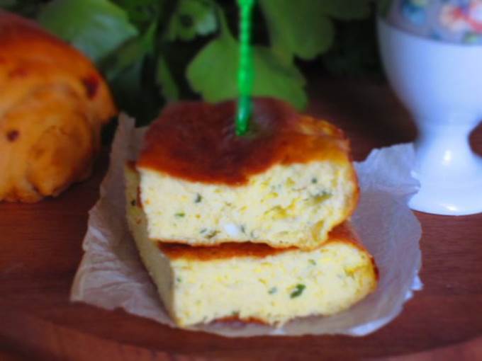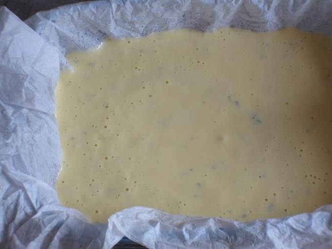 Пергамент намочить и хорошо отжать.Яичную смесь выложить в форму с пергаментом и запекать в разогретой до 180°С духовке 35 минут.