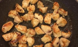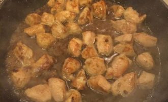 • Разогреть сковороду с толстым дном, добавить растительное масло и обжарить мясо на сильном огне.