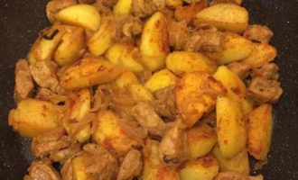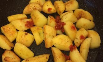 • На той же сковороде обжарить картофель до готовности, добавить аджику и перемешать.