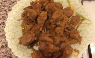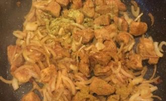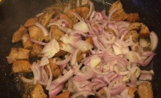 • Когда мясо будет готово, добавить лук и тушить 3 — 4 минуты.