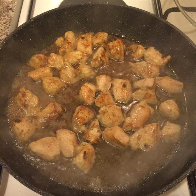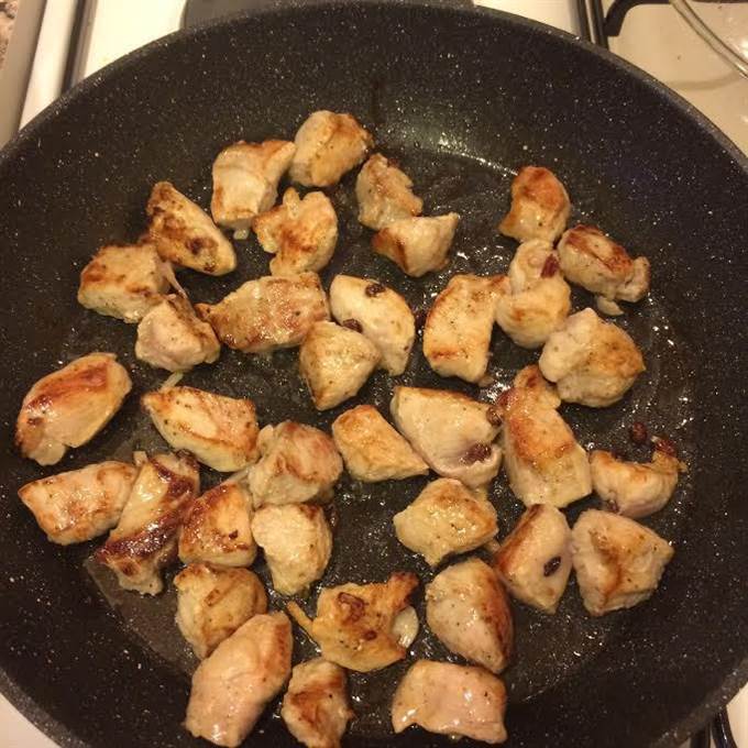 • Разогреть сковороду с толстым дном, добавить растительное масло и обжарить мясо на сильном огне.