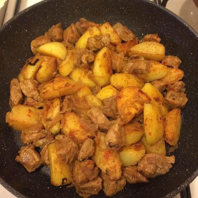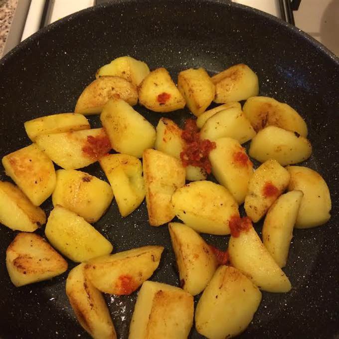 • На той же сковороде обжарить картофель до готовности, добавить аджику и перемешать.