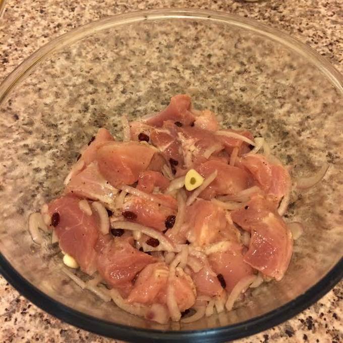 • Для этого блюда мясо я мариную 5 — 6 часов, так оно получается более нежное и ароматное.