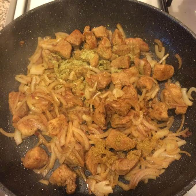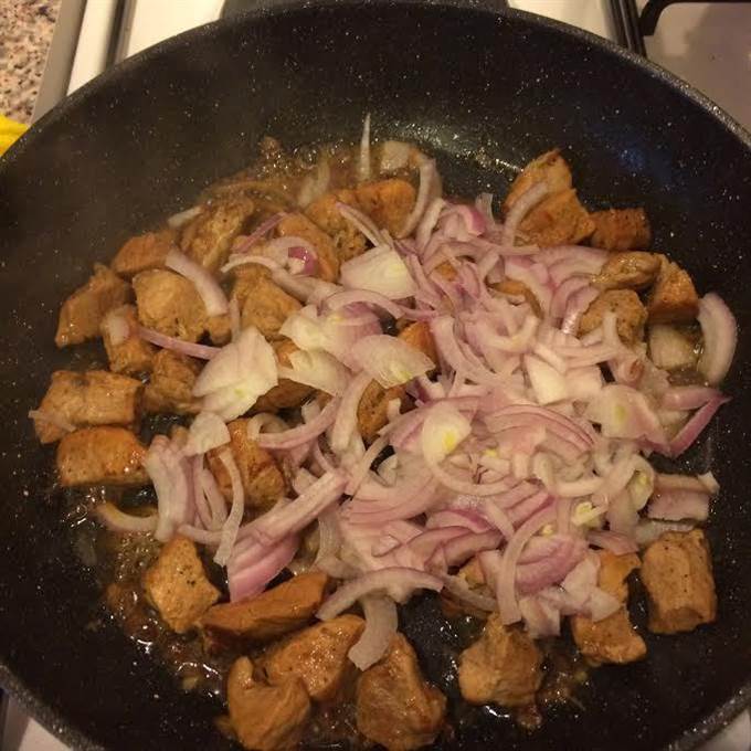 • Когда мясо будет готово, добавить лук и тушить 3 — 4 минуты.