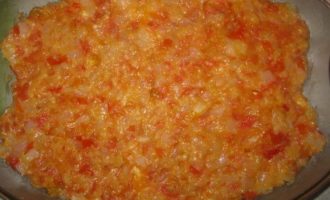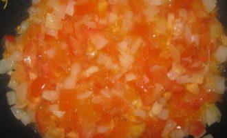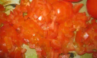• Затем добавляем мелко нарезанные или тертые на терке томаты. Солим, добавляем специи. Перемешиваем и жарим 5-7 минут.