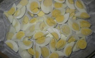 • Вареные яйца разрезаем на дольки или четвертинки в форму с растительным маслом.