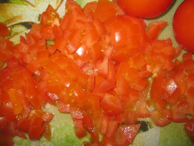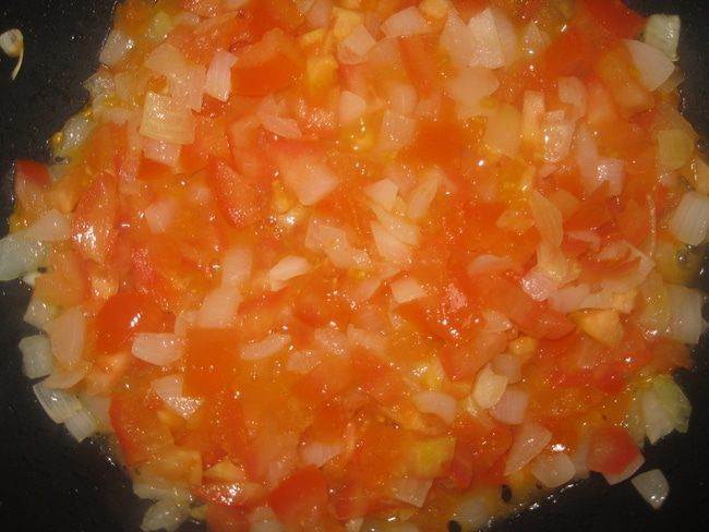 • Затем добавляем мелко нарезанные или тертые на терке томаты. Солим, добавляем специи. Перемешиваем и жарим 5-7 минут.