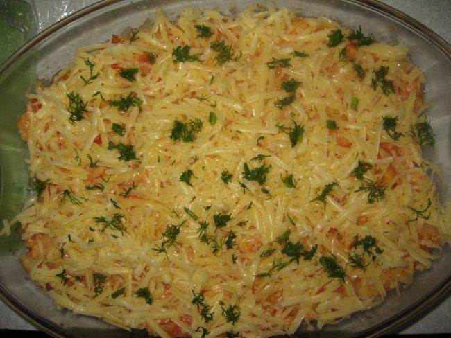 • Посыпаем тертым сыром и укропом. Ставим в духовку на 10-12 минут.