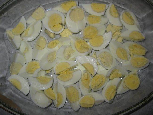 • Вареные яйца разрезаем на дольки или четвертинки в форму с растительным маслом.