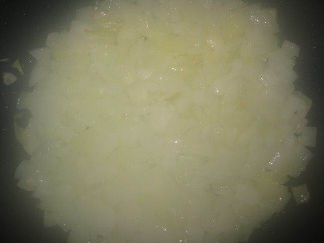 • Нарезаем лук и жарим его на растительном масле 3- 5 минут. Добавляем измельченный чеснок.