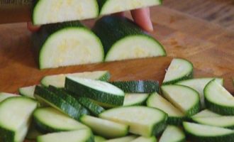 Цукини, не очищая, разрезать вдоль пополам, затем полукружьями.