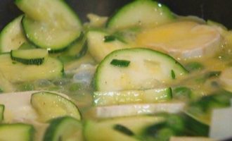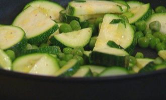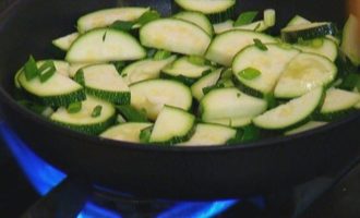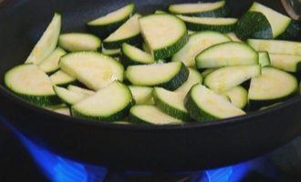 Разогреть в сковороде со съемной ручкой оливковое масло и обжарить цукини.