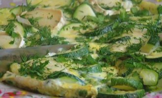 Выложить сыр на цукини с горошком, залить яйцами и отправить в разогретую духовку на 10 минут.