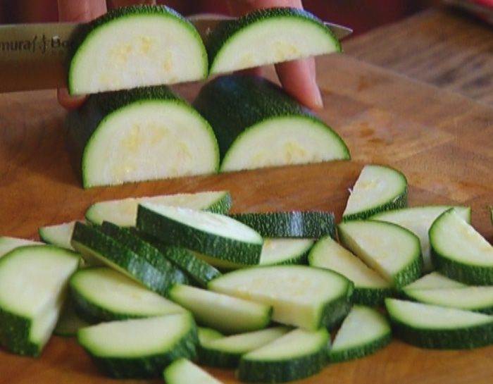 Цукини, не очищая, разрезать вдоль пополам, затем полукружьями.