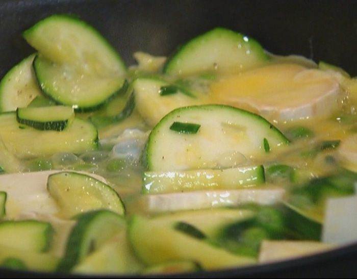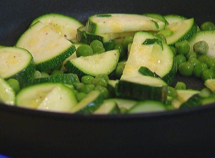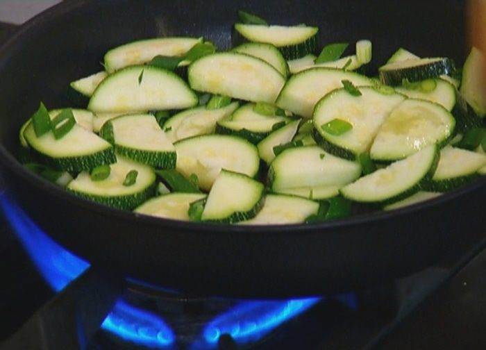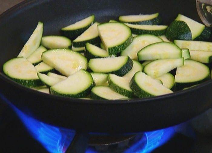 Разогреть в сковороде со съемной ручкой оливковое масло и обжарить цукини.