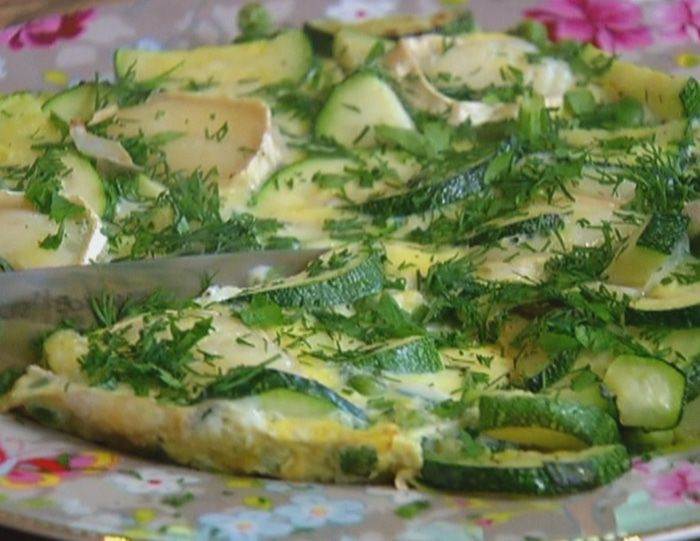 Выложить сыр на цукини с горошком, залить яйцами и отправить в разогретую духовку на 10 минут.