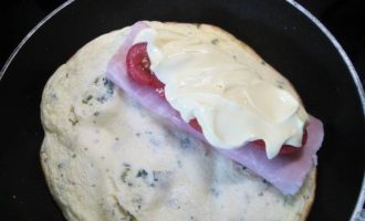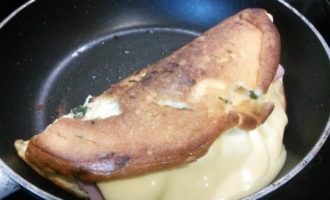 Накрываем второй половиной омлета и допекаем еще 3-4 минуты, пока сыр расплавится.