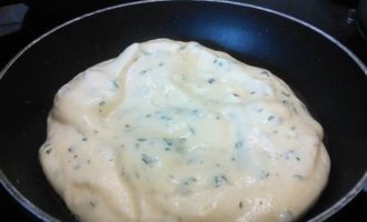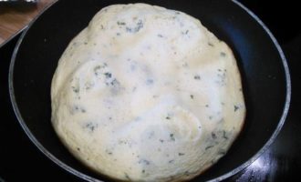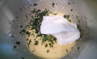 Добавить половину зелени и ввести частями взбитые белки, аккуратно размешать лопаточкой.