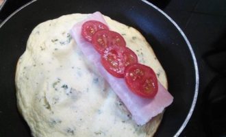 На одну половину омлета выкладываем ветчину, для сочности я добавила помидор.